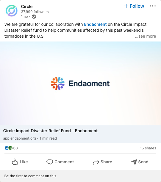 Following the devastating tornadoes that hit several states in the U.S. during December, Circle worked with Endaoment to set up a charity fund to support several organizations that offered aid in the various communities.