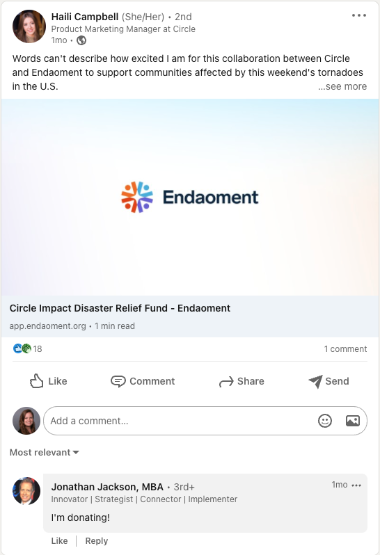 It is extremely difficult to pinpoint just one favorite post, but I would love to call out the content pieces around the Circle Impact Disaster Relief Fund.