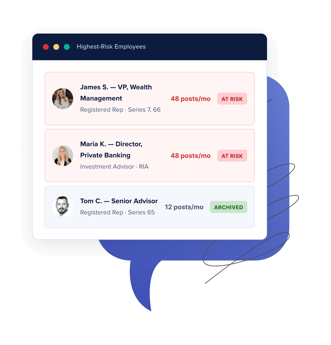 We surface your most active employees on LinkedIn — the ones posting, commenting, and engaging most frequently — sorted by activity level so you can see where to focus your compliance attention first.